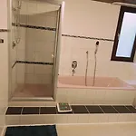 Une salle de bain comprend une baignoire et une douche. Un sèche-cheveux et des serviettes sont également disponibles.
